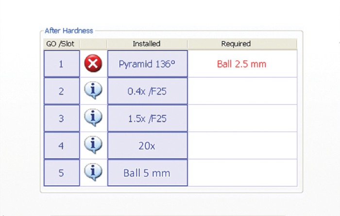 勃氏: 98.07 - 294.2 - 306.5 - 612.9 - 1226 - 1839 - 2452 - 4903 - 7335 - 9807 - 29421 N (10 - 30 - 31.2 - 62.5 - 125 - 187.5 - 250 - 500 - 750 - 1000 - 3000 kgf) 維克氏: 98.07 - 147.1 - 294.2 - 490.3 - 980.7 - 1176.8 N (10 - 15 - 30 - 50 - 100 - 120 kgf) 洛氏: 588.4 - 980.7 - 1471 N (60 - 100 - 150 kgf) 其它荷重: 49 - 132 - 358 - 961 N (60 - 100 - 150 kgf - 針對塑膠和橡膠按照EN-ISO 2039 標準) |
