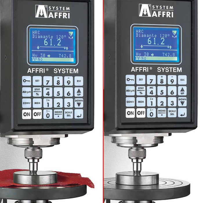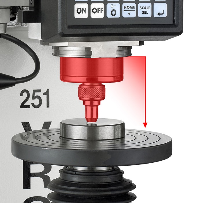 荷重: from 0.3 to 250 kgf (From 2.940 to 2452 N) 維克氏 ISO 6507 / ASTM E-384 - Knoop ISO 4545: HV0,3 - HV0,5 - HV1 - HV2 - HV2,5 - HV3 - HV5 - HV10 - HV15 - HV20 - HV30 - HV50 - HV100 / HK0,3 - HK0,5 - HK1 洛氏 ISO 6508 / ASTM E-18: HRA - HRB - HRC - HRD - HRF - HRG - HRL - HRM - HRR / HRN - HRT 勃氏 ISO 6506 / ASTM E-10: HB 30 - HB 10 - HB 5 - HB 2,5 MPa (F/D2)